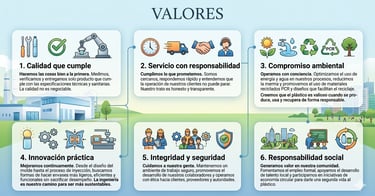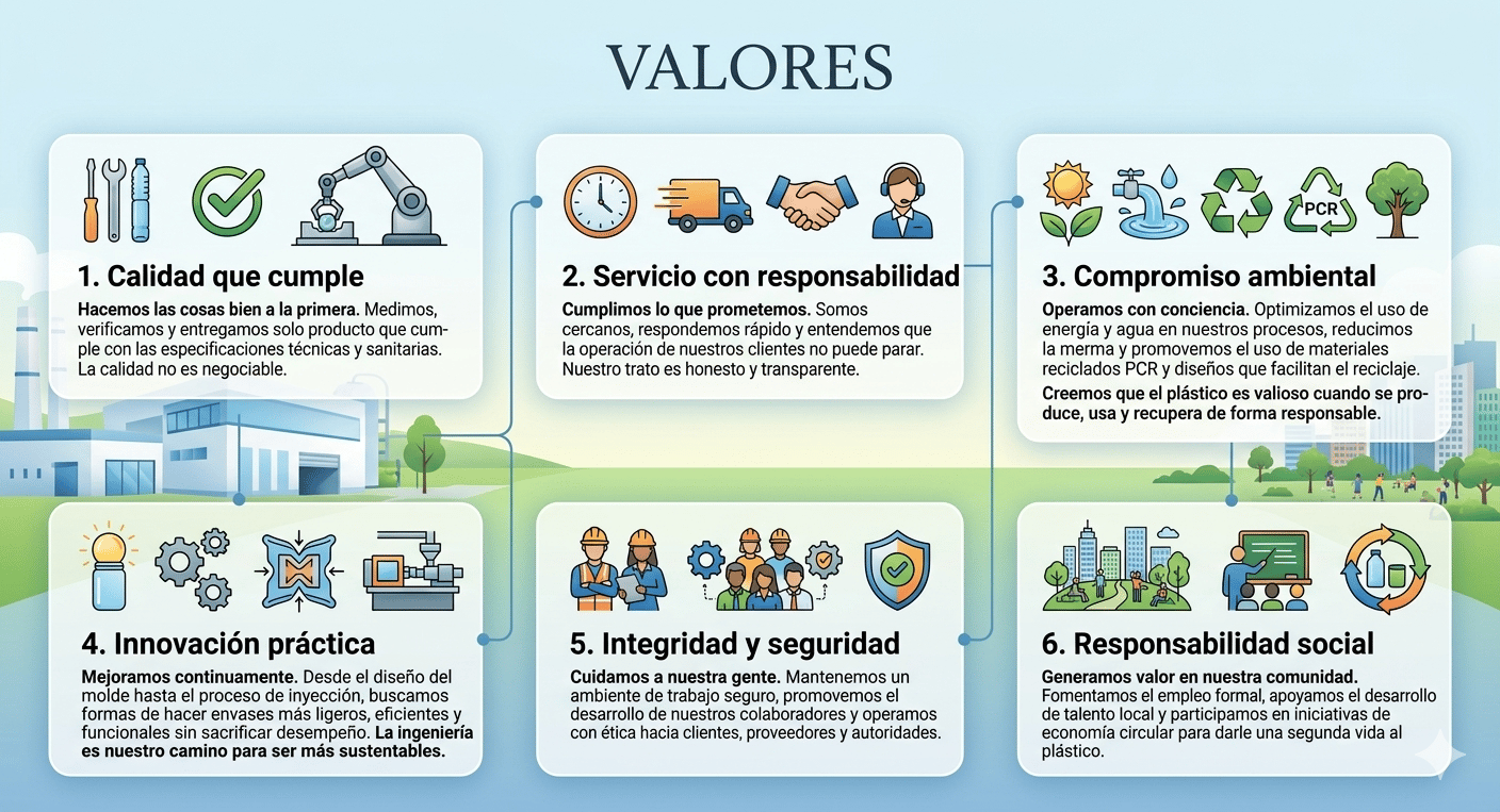 Ser en 2030 la empresa mexicana líder en desarrollos de plástico reconocida por su innovación, calidad y compromiso con la sustentabilidad. Queremos ser el referente nacional para las industrias de alimentos, agroquímicos, farmacéutica, cosméticos y más, destacándonos por desarrollar envases funcionales, incorporar materiales reciclados y biobasados, y mantener una operación que genere valor para nuestros clientes, colaboradores y comunidad.